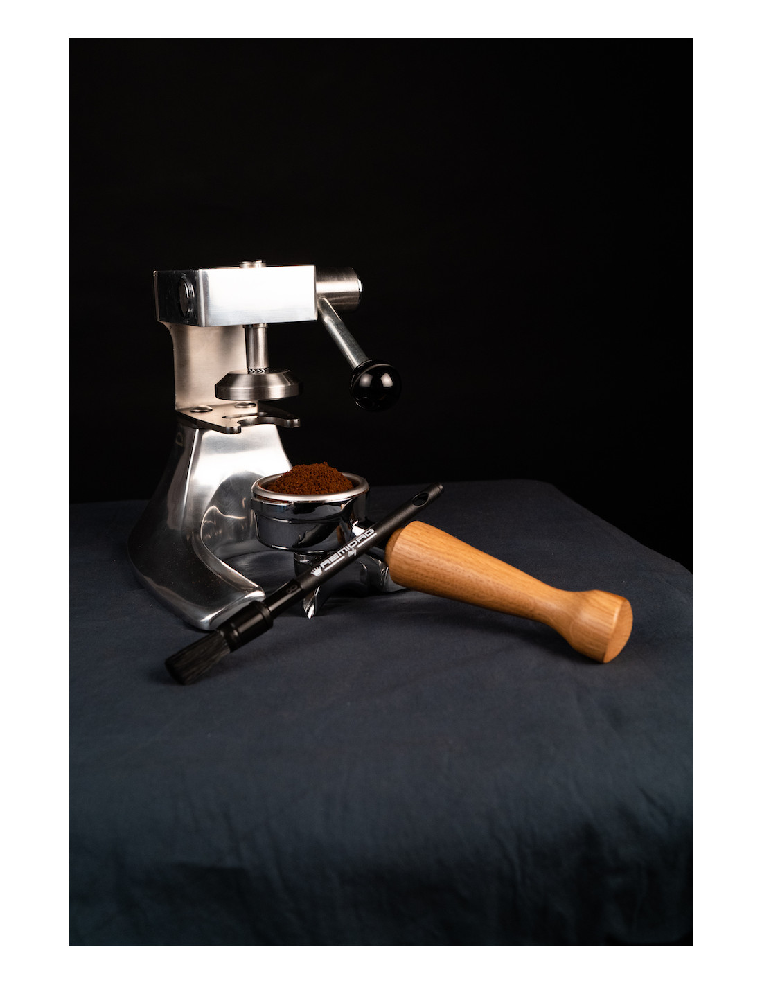 Sistema de prensado manual con base de apoyo para prensado constante y regulable de café.